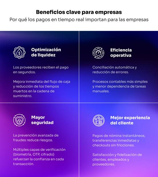 - Los pagos instantáneos permiten transferencias 24/7, aceleran la liquidez y reducen errores tanto para empresas como para consumidores.