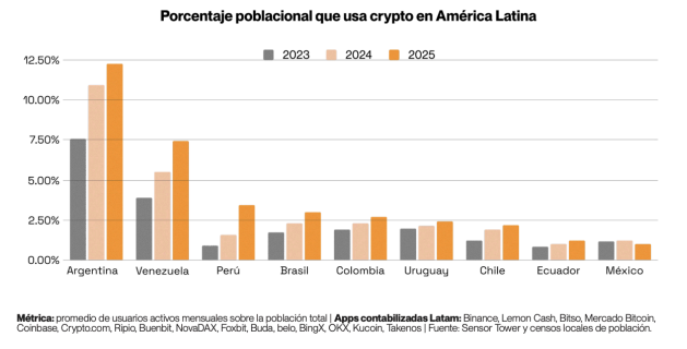 Dentro de la región, si bien Argentina lidera en usuarios activos mensuales per cápita, totalizando el 12,4% de la población, Colombia es el quinto país de mayor rápido crecimiento de uso de apps crypto.