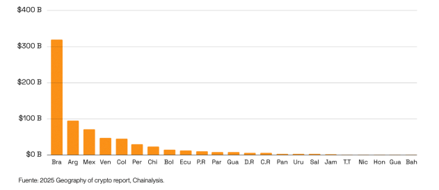 Brasil lidera América Latina con más de 318.800 millones de dólares en valor crypto recibido. Esto representa casi un tercio del volumen de la región y un crecimiento anual cerca del 250%, marcado principalmente por las transacciones institucionales. Sin embargo, Colombia se posiciona como el 5to país de mayor volumen crypto recibido de la región, con un total de 44.2 mil millones de dólares, un crecimiento superior al 85% frente al 2024.