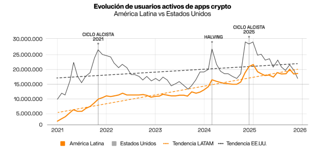 ● América Latina crece 3 veces más rápido que EE.UU en usuarios crypto activos.